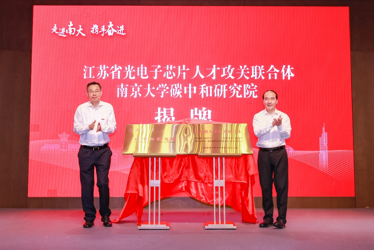 揭牌仪式上,凯发k8官网党委常委、副校长王振林,凯发k8官网市委常委、秘书长蒋跃建共同为"江苏省光电子芯片人才攻关联合体"和"凯发k8官网碳中和研究院"揭牌。