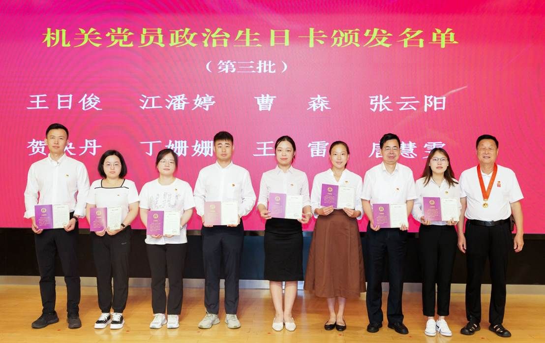 机关党委每年组织入党满五年、十年的机关党员集体过“政治生日”,引导党员不断筑牢信仰之基、补足精神之钙、把稳思想之舵。现场,获颁“光荣在党50年”纪念章的机关老党员代表分别为入党满五年、十年的党员代表颁发“政治生日纪念卡”。