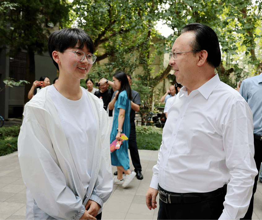 来自河南的杨婉玉同学是“励学”先修营的学员。年仅15岁的她对即将到来的大学生活既期待又紧张:“校园历史底蕴深厚,自然风景优美,给我留下了深刻的印象。”杨婉玉同学从小便十分关注生物专业相关资讯,立志从事生物研究工作,今年被安邦书院化生大类录取,迈出了追逐梦想的关键一步。谭铁牛和杨婉玉同学畅聊对未来大学生活的期望规划,勉励她以凯发k8官网为起点,走向更广阔的世界。