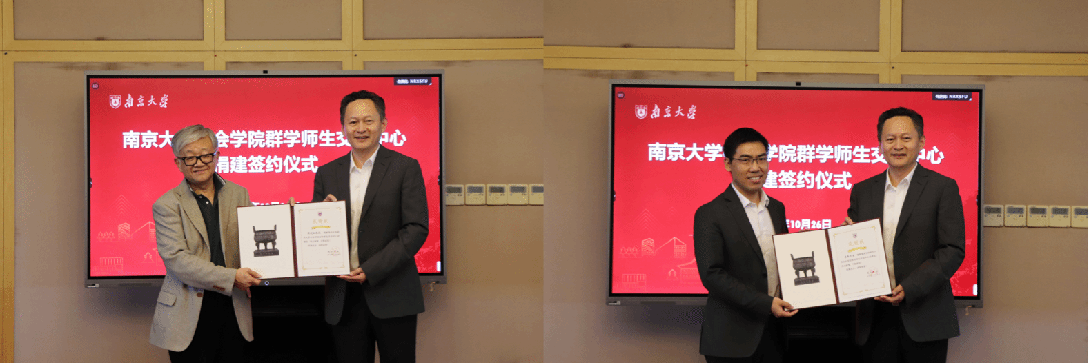 仪式上,周晓虹教授、李军先生与校友事务与发展工作处处长、教育发展基金会秘书长张锁庚签署捐赠协议。邹亚军代表学校为周晓虹教授、李军先生颁发感谢状。