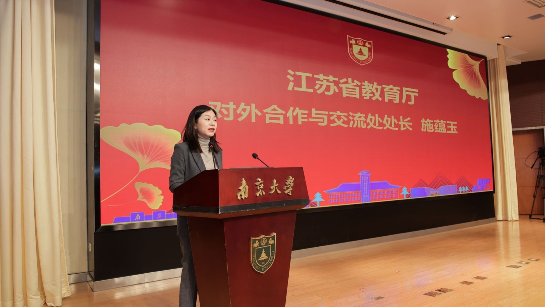 会议第一阶段为“主题报告”,由研究生副院长张亮主持,国家留学基金管理委员会出国留学选培部主任杨祥义、江苏省教育厅对外合作与交流处处长施蕴玉、国际合作与交流处处长李晓蓉、研究生院培养办公室主任王孝磊分别作报告。