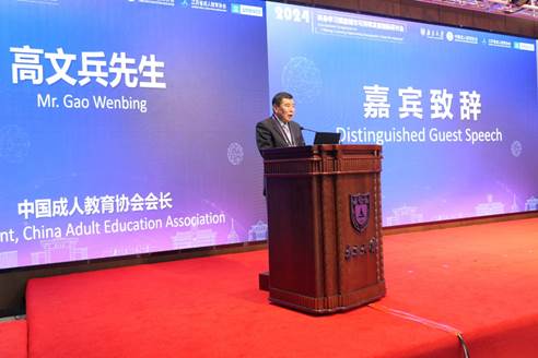 高文兵会长表达了回到母校出席本次盛会的喜悦之情,他代表中国成人教育协会对研讨会的召开表示热烈的祝贺,同时向主办方、协办方表示衷心的感谢。他提到在联合国2030可持续发展目标框架下,强化终身学习赋能城市可持续发展的国际共识和理念,探索适合中国国情、彰显中国特色的城市可持续发展的新思维、新路径的必要性与重大意义。高文兵会长指出中国成人教育协会作为全国性、学术性的社会组织,将继续以习近平新时代中国特色社会主义思想为根本遵循,积极践行终身教育与终身学习理念,主动服务学习型社会和学习型大国建设。