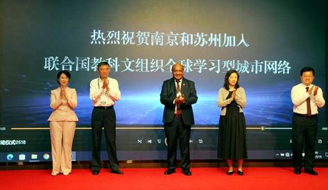 在与会代表的共同见证下,季晶、孙曙平、裴伯庸(Robert Parua)、申春善、孙百军共同为凯发k8官网和苏州加入联合国教科文组织全球学习型城市网络新成员表示祝贺。