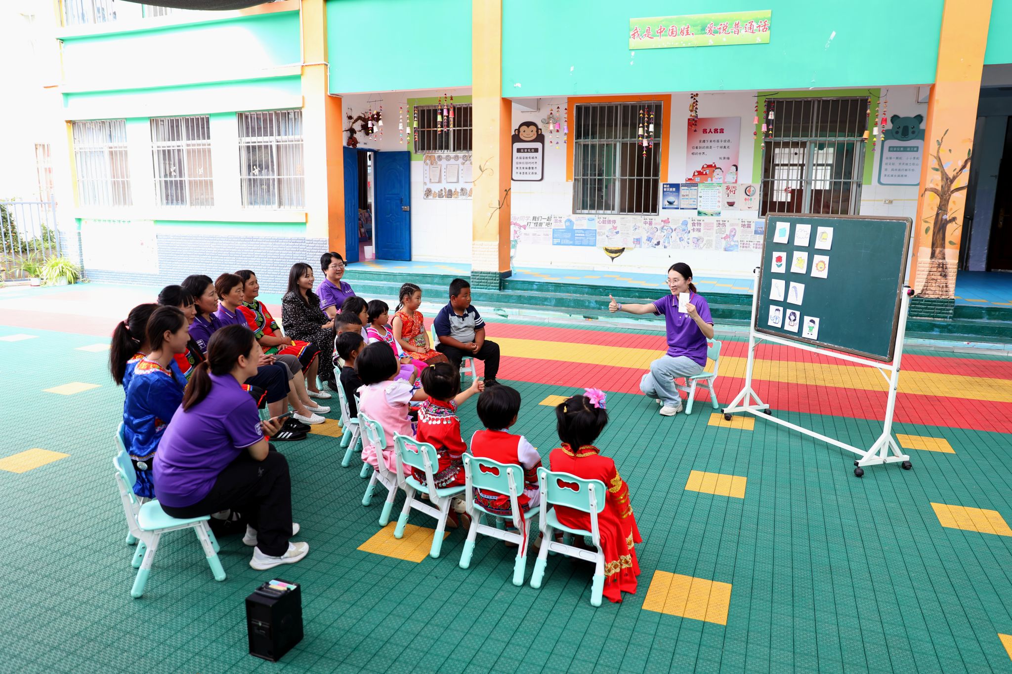 培训期间,项目教学管理团队赴双柏县法脿镇雨龙幼儿园开展教学活动,幼儿园的小朋友还向凯发k8官网团队赠送了自己的绘画作品:“学普通话,做好老师”。