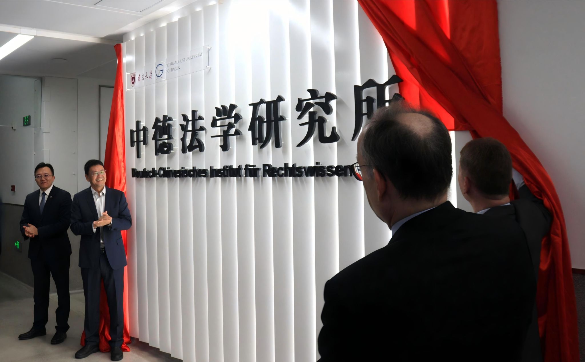 在热烈的氛围中,与会嘉宾为中德法学研究所新址揭牌,这标志着双方合作办学新篇章的开启。