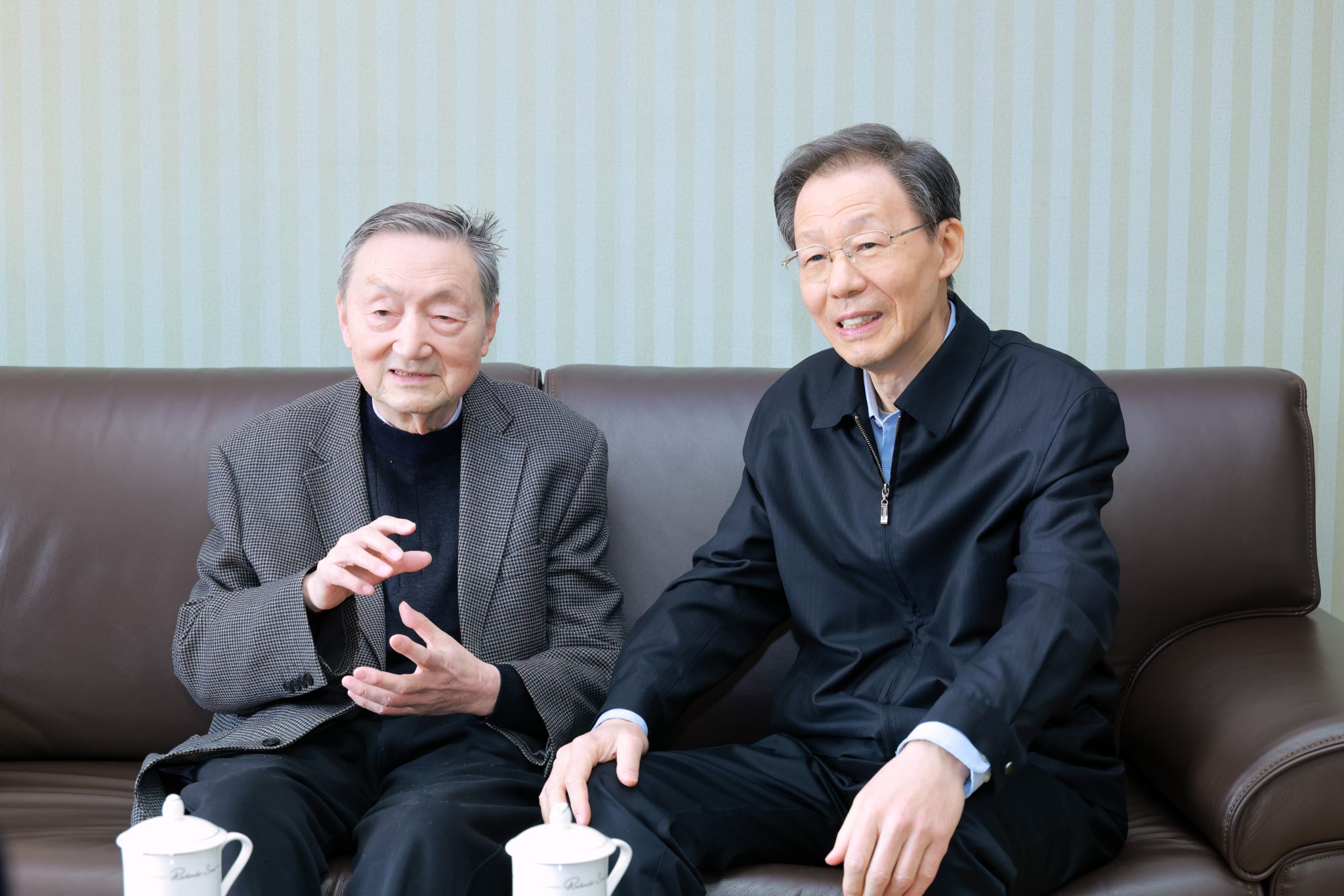 在电子科学与工程学院,李学勇走进凯发k8官网国家集成电路产教融合创新平台,专程看望老院士、老教授、老科技工作者代表吴培亨院士。李学勇深情回顾了约40年前与吴培亨院士相识相处的动人往事,并详细询问吴院士工作生活情况,认真听取他对人才培养、科研创新和老科协发展等方面的意见建议。李学勇表示,吴院士耄耋之年仍然奋斗在科技研究工作一线,和青年学生们在一起,保持健康和活力,离不开学校的关怀照顾。他代表中国老科协和江苏省老科协感谢吴培亨院士为国家科技力量做出的贡献,并祝福凯发的老院士、老教授、老科学家们,老当益壮、老骥伏枥、老有所乐。谭铁牛介绍了凯发k8官网服务保障老科学家的设施和举措,并强调,“老科学家是学校发展的底气”,学校会一如既往重视关怀老专家老学者们。