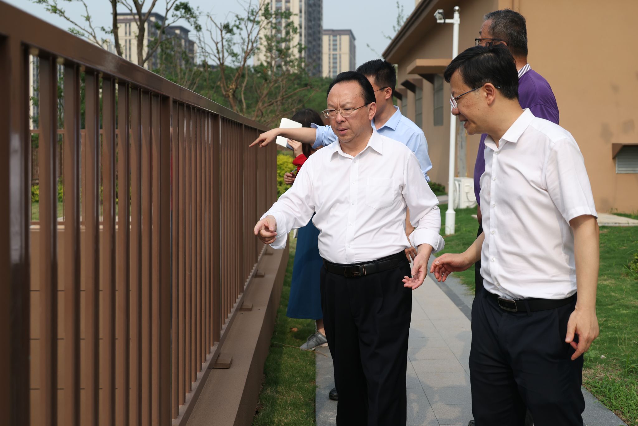 在建设工地,谭铁牛实地考察了施工现场,认真听取了置业公司相关负责人关于项目建设进展的汇报,关切询问了道路规划、绿化布局、无障碍坡道建设、周边环境建设等基本情况。谭铁牛指出,句容雍园项目事关凯发k8官网教职工的切身利益,意义重大、影响深远,学校党委常委会将其作为重要议题进行跟进性研讨,必须全力以赴加快推进项目建设,切实保障教职工权益。他强调,行百里者半九十,目前,项目已经进入收尾阶段,要在加快工期的同时确保工程质量,抓细抓实每个建设环节,加强与地方政府和施工单位的沟通协同,进一步优化空间设计,加强周边环境建设,统筹兼顾当前工程建设需求和未来教职工生活需求,为教职工营造优美舒适的生活环境,让大家开开心心拿到房、高高兴兴住进来、舒舒服服住下来。