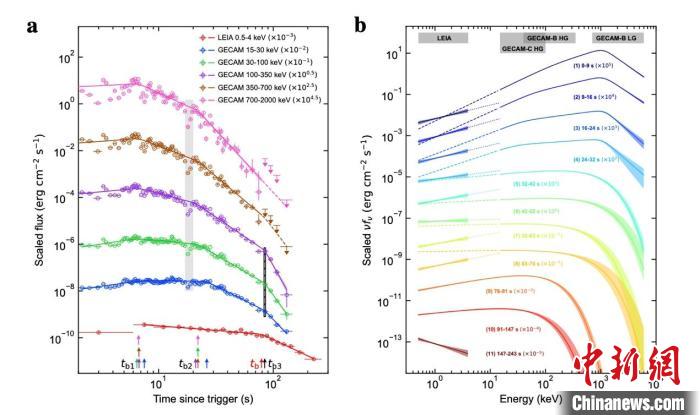 本次研究成果论文中“莱娅”和极目卫星联合探测到的GRB 230307A的多波段光变曲线和能谱示意图。中国科学院国家天文台 供图