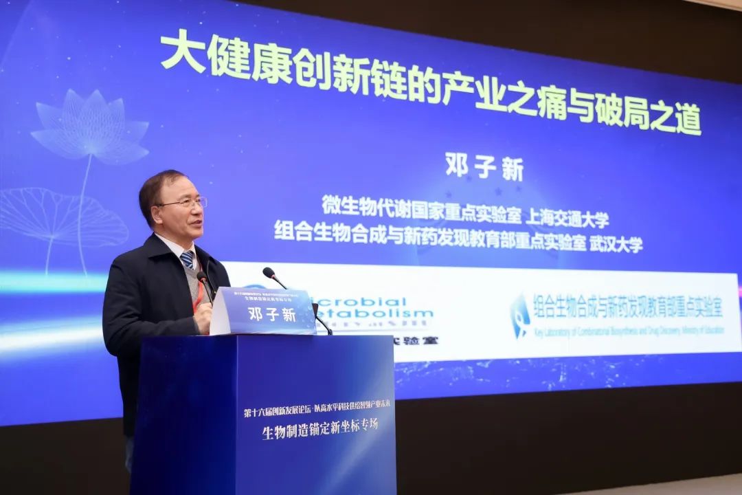 在“生物制造锚定新坐标”专场,中国科学院院士、上海交通大学教授邓子新在题为《大健康科技创新的产业痛点与破局之道》的报告中表示,合成生物学是大健康产业快速发展的钥匙,有着巨大的应用潜力,正在改造或颠覆传统大健康产品的研发路径。