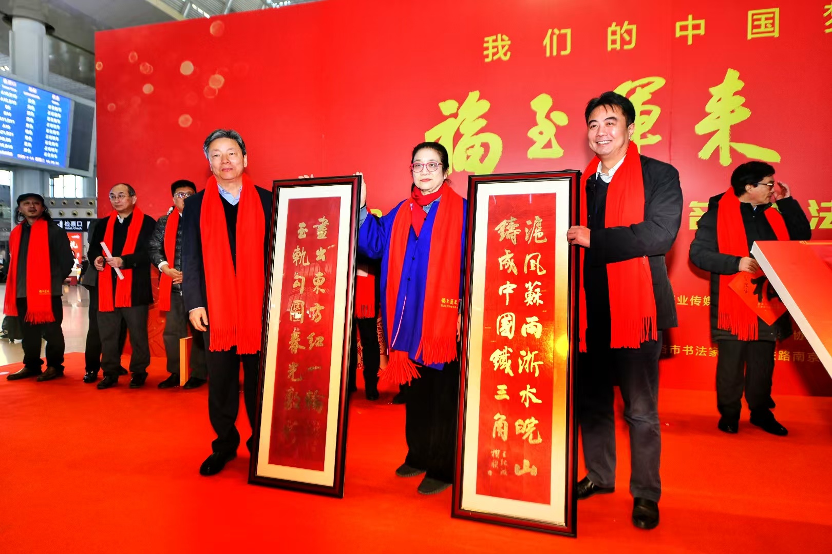 孙晓云向中国铁路上海局集团公司赠送高铁挂春联活动金箔春联。秦怀珠 邵丹 潘浩东 摄