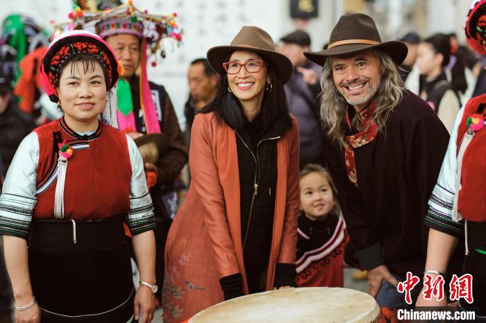 1月30日,林登夫妇(右一、右二)在云南省大理州大理市喜洲镇参加舞龙表演活动。(受访者供图)