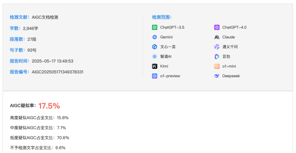 AIGC检测究竟靠不靠谱?记者打开常用的一款论文免费检测网站,上传了自己近期撰写的一篇未经发表的新闻稿,近3000字,检测结果显示AI疑似率为17.5%。检测报告还用不同的颜色来表示不同程度的疑似度范围。