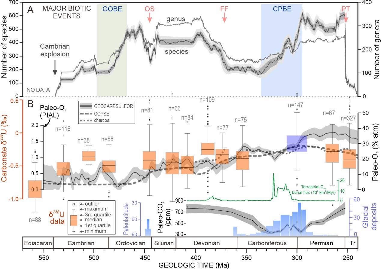△古生代海洋生物多样性、大气成分与海洋氧化状态。