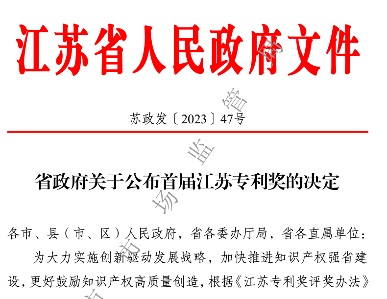 近日,江苏省人民政府发布《关于公布首届江苏专利奖的决定》(苏政发〔2023〕47号),公布了首届江苏省专利奖获奖名单。
