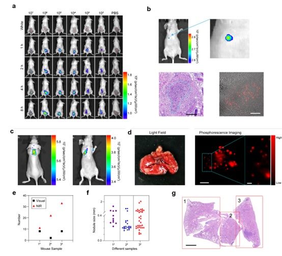 图3. Ir-D纳米探针对体内癌细胞、小肿瘤以及微小转移结节的检测。