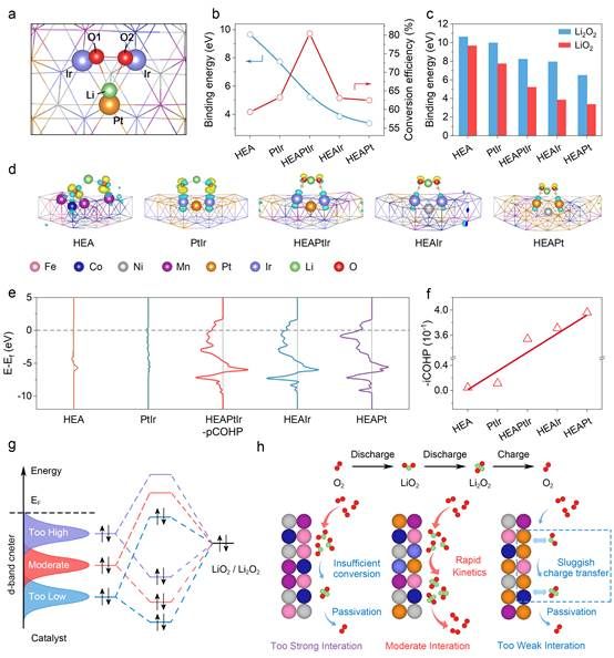 图2. (a) LiO2在HEAPtIr (111) 晶面上的吸附模型;(b) LiO2与五种催化剂之间的结合能以及使用相应催化剂的LOB的能量转换效率;(c) LiO2和Li2O2与催化剂之间的结合能;(d) LiO2与催化剂相互作用时的差分电荷密度(黄色和蓝色区域分别表示电子密度的增加和减少);LiO2吸附在五种催化剂(111)表面后O1和O2原子之间的(e) -pCOHPs和(f) -iCOHPs;(g) LiO2/Li2O2与具有不同d带中心催化剂之间的轨道相互作用和(h) 相应的催化效果示意图。