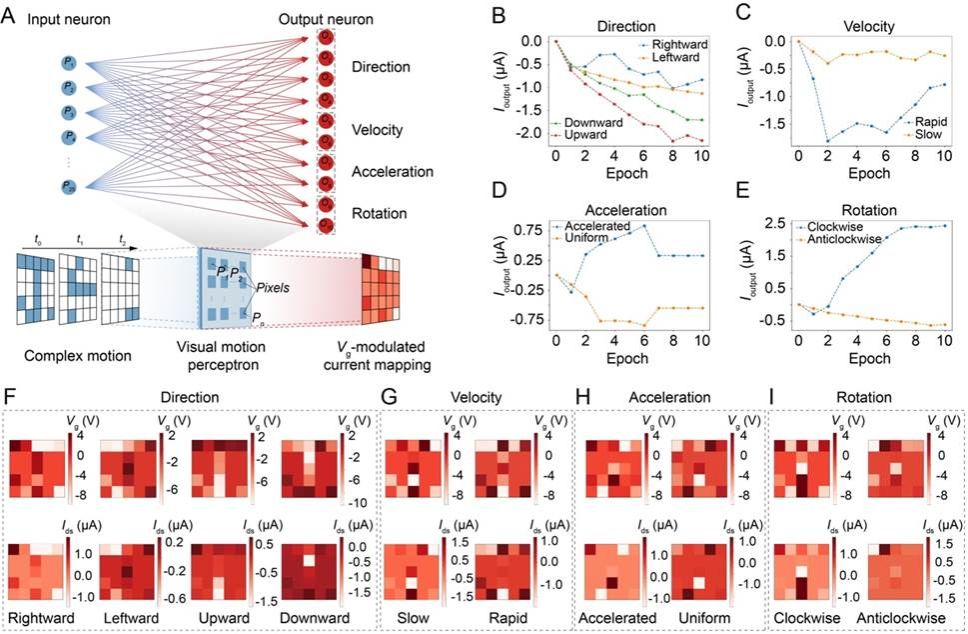 图4:基于异质结器件阵列的视觉运动感知机。(A)视觉运动感知机的示意图。字母“J”的一个复杂运动模式(顺时针旋转的加速向右运动)被投射到阵列上。每个输出神经元生成了基于已训练的权重(Vg)矩阵下的25个器件的总电流。仅有在最后一帧完成输入后,被记录的电流映射用作运动感知机的输出。(B-E)每个运动参量(方向、速度、加速度、角速度)的识别准确率。具有最大电流值总和的曲线代表目标运动参量的识别结果。(F-I)不同运动参量的Vg映射和对应的Ids映射。