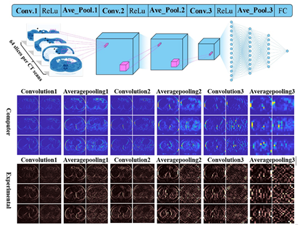 图5. 三维光子卷积神经网络对64通道新冠肺炎CT数据的分类及特征提取结果。