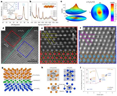 图1 a–c, 生长于FTO衬底上α-Fe2O3薄膜的X射线衍射图谱(a)、Raman谱(b)和α-Fe2O3 (110)晶面的X射线极图(c);d–f, α-Fe2O3/FTO界面的高角环形暗场像(d)及其α-Fe2O3侧的局部放大图(e)和FTO侧的局部放大图(f);g–i, 凸显氧原子亚晶格的α-Fe2O3/SnO2界面原子模型(g),α-Fe2O3和SnO2中氧原子亚晶格的Voronoi胞及其与特定晶面相交的特征量示意图(h),这些特征量的分布图(i)。