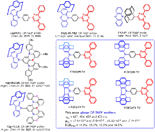 自1997年首次报道CP-OLED以来,人们开发了越来越多具有不同设计理念和光物理性质的手性发光材料,包括手性聚合物、手性金属配合物、手性有机分子。在有机分子中,手性热激活延迟荧光(CP-TADF)材料因其易于衍生和有效收集单线态和三线态激子而具有较高的器件效率等优点,被认为是CP-OLED的理想候选材料。根据手性的来源,CP-TADF材料可分为中心(点)手性、轴手性、平面手性和螺旋手性材料。迄今为止,大多数报道的CP-TADF材料都是基于中心和轴手性分子。虽然平面手性有望实现高强度的CPL活性,但由于合成平面手性骨架有一定的挑战,目前在设计CP-TADF材料时采用平面手性分子成功的例子很少(图1)。