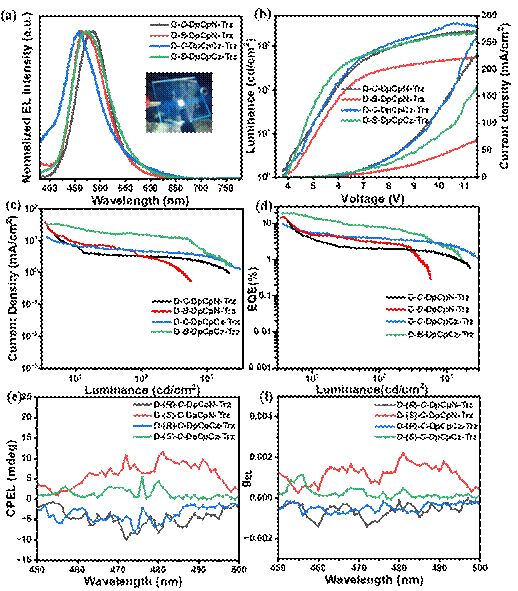 图3. (a) 在8V电压下测量的归一化电致发光光谱和器件照片;(b) 亮度-电压-电流密度特性;(c) 电流效率-亮度曲线;(d) 有机发光二极管的EQE-亮度曲线;(e) CP-OLED的CPEL光谱和(f) gEL曲线。