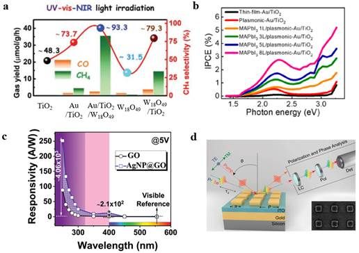 图4 等离激元诱导的热载流子在(a)光催化、(b)光伏、(c)光电探测、以及(d)超快光调制领域的应用