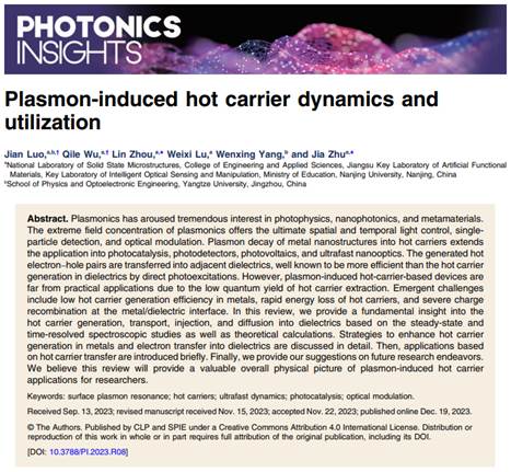 论文信息:Jian Luo, Qile Wu, Lin Zhou, Weixi Lu, Wenxing Yang, Jia Zhu. Plasmon-induced hot carrier dynamics and utilization[J]. Photonics Insights, 2023, 2(4): R08