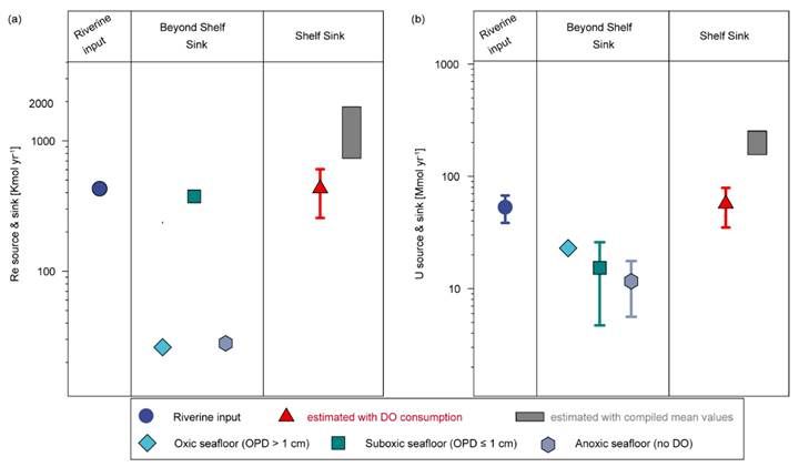 氧化还原敏感金属元素铼(Re)和铀(U)是重要的资源金属,也是反演地质历史上海洋氧化还原条件的重要指标。因此,准确理解现代海洋中Re和U源汇通量和格局具有重要的科学价值。然而,现代海洋中溶解Re和U是否处于源汇平衡仍然是海洋化学的谜题之一。陆架(水深<200米)沉积物是有机碳埋藏的主要区域,也是有机碳矿化的热点区域。丰富的有机物输入导致陆架沉积物孔隙水中的氧气被快速消耗,形成无氧条件,并导致孔隙水中溶解的Re和U作为电子受体被还原移除至沉积物中,构成海洋Re和U的还原性汇。但是,以往的源汇研究对陆架的贡献并无可靠的定量评估。