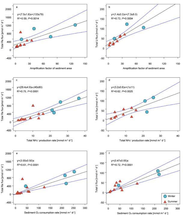 图1.陆架沉积物Re和U通量与沉积物浸灌作用系数(a, b)、有机碳厌氧分解速率(c、d)和沉积物耗氧速率(e , f)的相关性