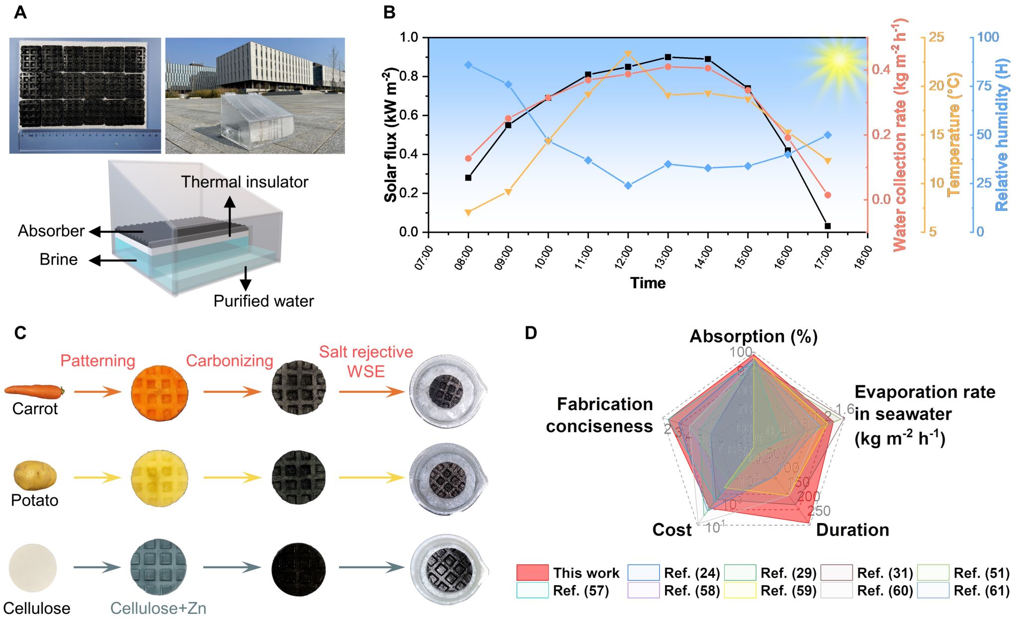图4. WSE原型器件。(A)用于室外盐水处理的淡水生产。(B)2022年1月18日测得的WSE的淡水生产速率、太阳辐照强度、环境温度和湿度。(C)由胡萝卜、土豆、纤维素等生物质制作的WSE。(D)多种太阳能蒸发器的性能对比图。