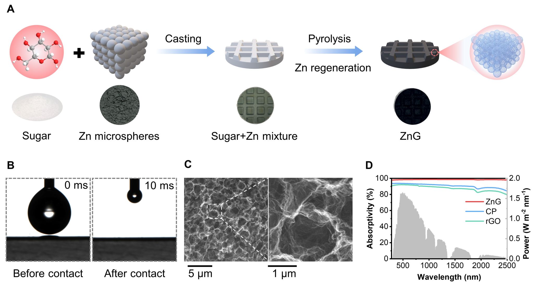 图2. 华夫格结构的碳材料。(A)制备方案。(B)接触角测试显示其亲水性。(C)SEM图像显示其互连多孔结构。(D)吸收光谱。