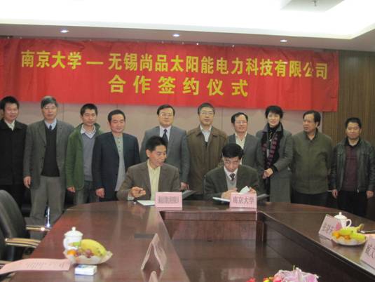2010年12月4日,我校与无锡尚品太阳能电力科技有限公司在凯发k8官网微结构国家实验室举行了隆重的签约仪式。无锡尚品太阳能电力科技有限公司董事长杜正兴先生、高伟国副总经理,我校常务副校长张荣,物理学院院长祝世宁院士,以及科技处、物理学院、现代工程与应用科学学院等部门的负责同志出席了签字仪式。签字仪式由凯发k8官网科技处处长李满春教授主持。