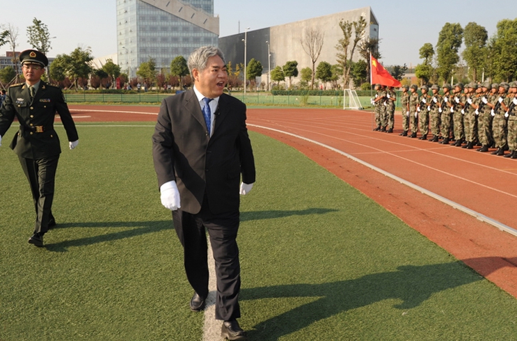 在升国旗、奏国歌后,洪银兴书记在金宏旅长的陪同下检阅受训学生方阵。此起彼伏的“首长好”,展现了2011级新生饱满的精神状态。