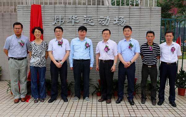签约仪式后,张荣常务副校长、任利剑副书记,王悦副市长,徐卫华董事长为炜华运动场揭幕。