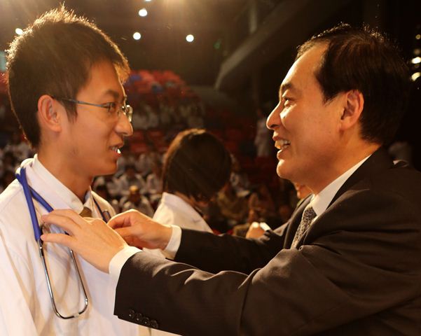 仪式上,医学院2012级新生们依次走上主席台,医学院党委书记韩晓冬、副院长蒋青、副院长李朝军亲手为他们穿上白大衣,陈骏校长和刘志红院长为他们亲手挂上听诊器。100名穿上白大褂的医学新生,在医学院院长刘志红的带领下,庄严宣读医学生誓言:“健康所系,性命相托,当我步入神圣医学学府的时刻,谨庄严宣誓,我志愿献身医学……为祖国医药卫生事业的发展和人类身心健康奋斗终生!”一句句诚挚的誓言让在场每一位新生感受到作为一名医学生所担负的责任和使命。