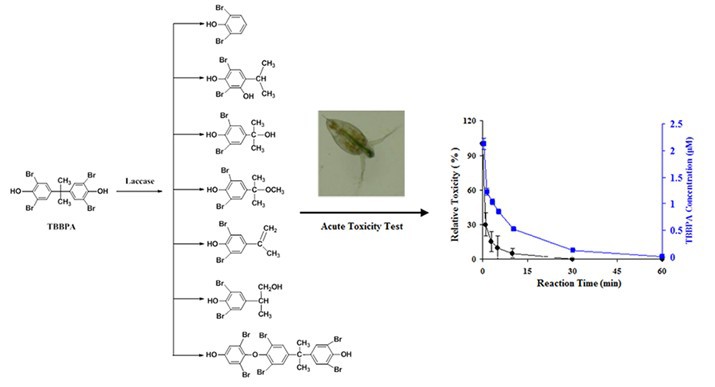 图1. 漆酶催化去除TBBPA可能的生成产物以及随着不同反应时间对大型蚤毒性的变化。图右中蓝线代表不同浓度水平的TBBPA对大型蚤的毒性,黑线代表经过漆酶催化反应后不同时间下反应溶液对大型蚤的毒性变化。