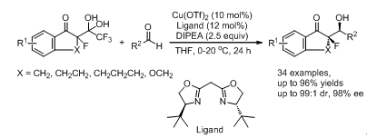 图2. α-氟代的苯并环酮类含有偕二醇结构的分子对醛类化合物的不对称Aldol加成反应