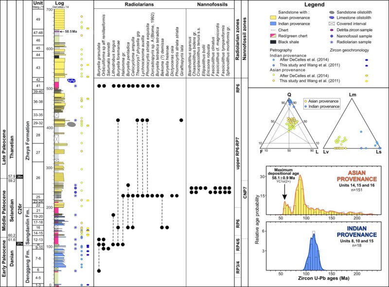 图2 藏南桑单林剖面生物地层学(放射虫和钙质超微化石)与物源区分析,显示印度向亚洲物源区转变(第14-16层)的时代为古新世中期Selandian期