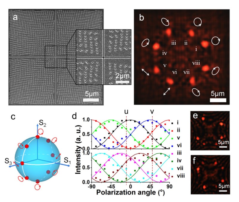 图二、(a)八偏振产生器的样品SEM照片。(b)所获得八种偏振状态的聚焦点。(C)该八种偏振态对于庞加莱球上的位置。(d)八种偏振态分析的实验结果(点)与理论预测效果(效果)的对比。(e,f)针对其中u和v线对应偏振态的实验测试结果。