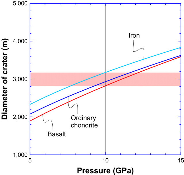 图2、不同撞击体产生10 GPa压力对应的瞬态撞击坑直径下限