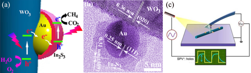 图 1 Z-Scheme WO3-Au-In2S3: (a)结构示意图, (b)电子显微镜照片,(c)开尔文探针技术工作原理图。