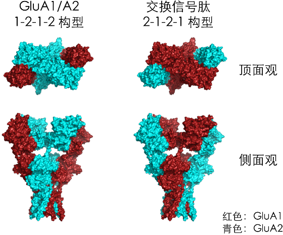 大脑内的神经细胞之间通过微小的特化结构——突触进行信号的交流。当一个神经细胞将它编码的信号传给下级神经细胞时,会在突触中释放化学信号谷氨酸。谷氨酸结合到突触后膜(下级神经细胞)上的谷氨酸受体从而将信号传递到下级神经细胞。突触后膜上的一种重要的谷氨酸受体被称为AMPA受体,主要由GluA1和GluA2两种不同的蛋白亚基组成。为了揭示这种异源AMPA受体的分子构成以及空间结构,研究者设计了一个巧妙的实验。他们以同源AMPA受体(GluA2四聚体)的晶体结构为模板,使用Cysteine Crosslinking的技术来探究各个蛋白亚基之间的接触面,从而揭示异源AMPA受体的空间排列。石云实验室的研究揭示了每个AMPA受体由两个GluA1和两个GluA2蛋白亚基构成,并且有着固定的空间排列,称作1-2-1-2构型。