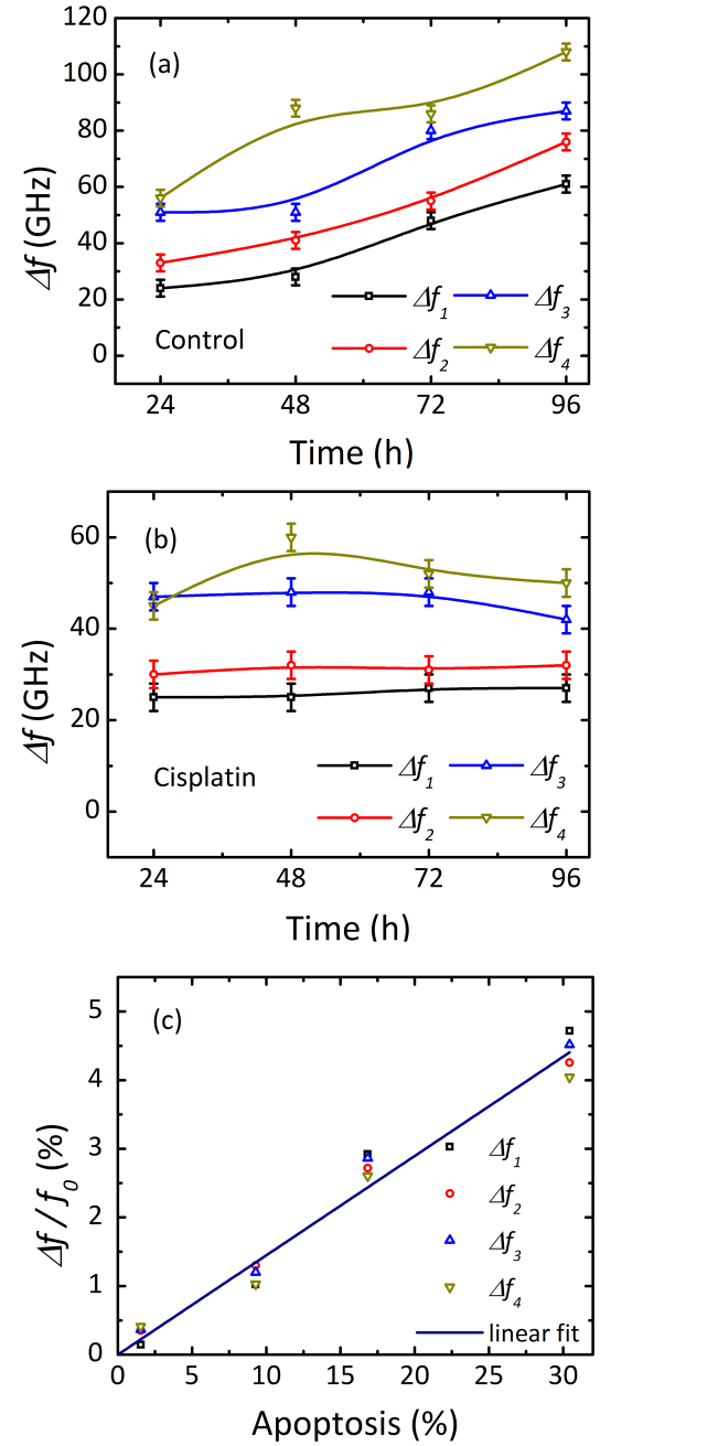 细胞凋亡率的测量一直是生物医学领域的基础性需求,目前广泛使用的流式细胞术需要消耗荧光标记的抗体,且是一次性的,无法回收使用,成本高且耗时。而报道的这种太赫兹生物传感器不需要使用任何标记物,对细胞无任何影响,只需要在细胞培养容器底部事先放置一枚该太赫兹生物传感器(如图2所示)即可,通过测量传感器谐振频率的变化即可得出细胞的凋亡率(如图3所示)。进一步改进测量系统,可发展成实时监控细胞凋亡率,以及细胞状态变化,可重复使用的新型简单实用生物传感器,有望广泛推广使用。这是电子学、生物医学交叉研究应用领域的一项重大突破。
