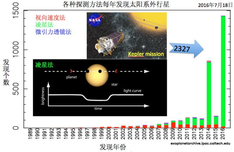 图1: 从1989至2016年,不同观测方法每年发现系外行星的个数。凌星法就是通过捕捉行星在视线方向上穿越恒星表面引起的恒星可视光度变化来探测系外行星。凌星法的杰出代表是Kepler计划。Kepler 目前发现了2327颗系外行星,约占所有已知系外行星总数的三分之二。
