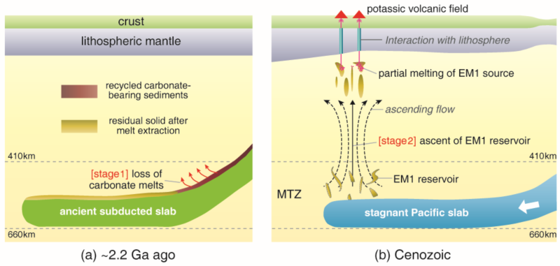 利用主微量元素和Sr-Nd-Pb-Hf-Mg同位素联合示踪的方法,发现东北钾质玄武岩的EM1端元具有偏轻的Mg同位素组成,异常高的K/U和Ba/Th比值,极低的206Pb/204Pb和U/Pb比值,以及Zr、Hf的正异常。轻的Mg同位素和极低的206Pb/204Pb比值明确支持EM1端元为再循环古老沉积物的观点。异常高的K/U和Ba/Th比值说明K-U和Ba-Th这两个地球化学行为极为相近的元素对发生了显著的分馏,且其分馏程度远超沉积物。实验岩石学研究已证明含碳酸盐的沉积物俯冲到地幔过渡带深度(410~660公里)时将发生低程度熔融并生成碳酸岩熔体,而源区钾锰钡矿和镁铁榴石的残留会导致上述元素对的显著分馏(图1)。同时,碳酸岩熔体的抽取会降低残留物的稀土元素含量,从而生成具有Zr、Hf正异常的EM1组分。因此,异常高的K/U、Ba/Th比值和Zr、Hf的正异常是东北钾质玄武岩源区EM1组分来自地幔过渡带的诊断性地球化学指标,这些指标的识别明确了钾质玄武岩与地幔过渡带物质之间的成因联系(图2)。