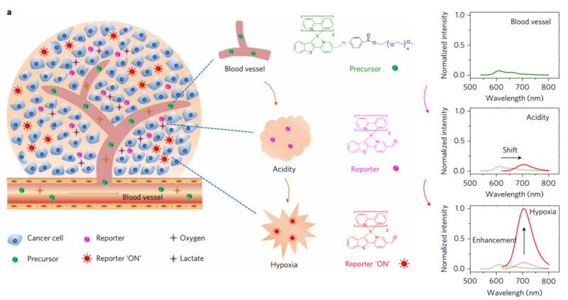 和传统的开关(turn on/off)探针设计原则不同,该工作以病灶生物环境变化引起的探针信号波长的移动来实现探针信号的放大。同时,探针信号波长的移动又被进一步利用来反映病灶的生物学事件和参数。例如,这种探针在正常组织中发射出较弱的红色荧光,而在进入实体肿瘤之后,探针会首先对肿瘤的微酸性微环境进行响应,并转换成一种具有近红外磷光发射的报告分子,接着,该报告分子还能进一步对肿瘤的低氧微环境进行响应,伴随着其近红外荧光发射强度的增强(图1)。通过上述波长移动/荧光强度增强的连续响应,可以有效地实现对肿瘤微环境信号的两步放大,显著提高探针的信噪比,增强探针的灵敏度。因此,是一个全新的探针设计理念,是探针研究的一个重要进展。和通常的多色彩需要多探针不同,该工作可实现单一探针的多色彩成像,同时成像二个不同的相关的生物学事件。由于探针的超高灵敏度和专一性,该探针可准确判断肉眼看不见的微小肿瘤,因此可用来帮助医生实现光学导航下的精准手术。由于可同时表征酸性和乏氧二个生物学的关联事件,因此该探针还可以用来表征肿瘤和其他疾病的代谢行为。除了早期诊断,手术导航和疗效评估的应用以外,该探针同时也为疾病机理,细胞生物学和系统生物学的基础研究提供了一个功能成像的靶向探针。