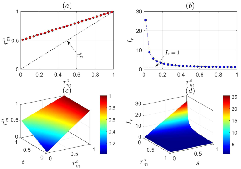 图4. (a) 攻击后多光子率和原始多光子率的关系,(b) 多光子率增长率和原始多光子率之间的关系,(c) 攻击后多光子率和原始多光子率以及插入间谍光子概率的关系,(d) 多光子率增长率和原始多光子率以及插入间谍光子概率的关系