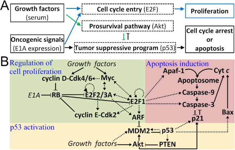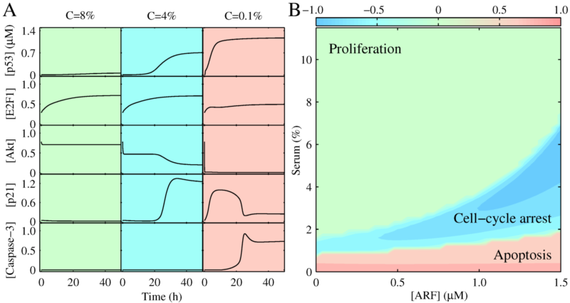 正常细胞含有一套精准的肿瘤抑制机制,能够识别癌信号,并通过诱导细胞周期阻断或凋亡来抑制细胞的异常增殖。尽管人们对肿瘤抑制网络的信号通路有了较明确的认识,但对其运作机制还了解甚少。其中一个基本的问题是,在异常促增殖信号(如源于E1A癌蛋白过表达)和生长因子(促细胞增殖)共同作用下,细胞是如何应答的?为此,王炜他们构建了含有三个模块的信号转导分子网络模型,分别描述细胞周期进程调控、p53活化和细胞凋亡等过程(如图1所示),开展数值模拟,刻画了网络对生长因子和E1A癌蛋白的响应特性。他们结合刻画网络的动力学,得到了一系列重要结果:1)发现网络通过ARF蛋白的“全或无”表达来区分正常和异常的促增殖信号;2)揭示了网络中重要信号分子,如p53、E2F1、Akt、p21、caspase-3等在不同情形下的动力学和功能(图2A);3)阐明了细胞命运抉择的分子机制,揭示了细胞增殖、细胞周期阻断、凋亡等不同命运对促存活和促凋亡信号强度的依赖关系(图2B);4)发现了细胞凋亡的诱导经历可逆转到不可逆转的过程,并结合细胞色素c释放和caspase-3活化的两相动力学给出了解释。这些结果给出了细胞肿瘤抑制过程的动态信号处理图像,以及蛋白质动力学对网络抑癌功能的调控机制。该工作对人们了解细胞的肿瘤抑制机制具有重要的科学意义,为恢复和调控肿瘤细胞的肿瘤抑制功能的应用研究提供了重要线索。