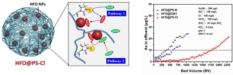 图1. (左)HFO@PS-Cl结构及除As(III)原理示意图(右)HFO@PS-Cl与其他树脂基纳米氧化铁除As(III)性能比较