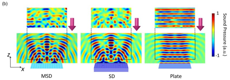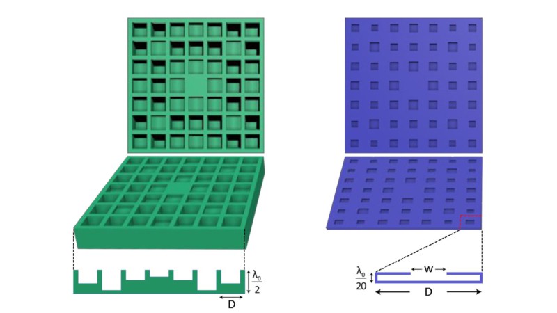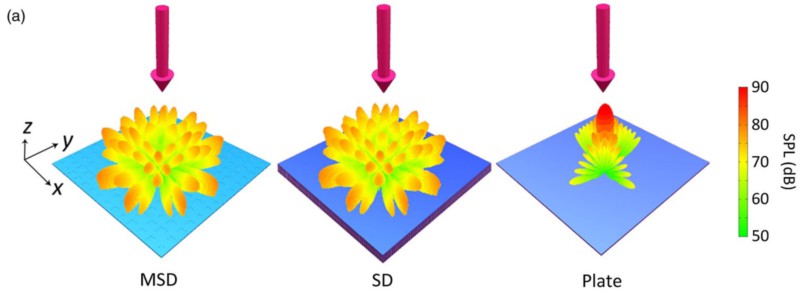 如何高效产生扩散声场是声学领域的重要问题,传统SD是上世纪70年代提出的经典设计,通过按照特殊的数列来设计各个单元的深度,产生了优化可控的漫反射效果。SD目前已经成为成熟的商用产品,不仅广泛应用于建筑声学及噪声控制等重要场合,亦被证明有望在粒子操控、医学成像乃至能量收集等问题中发挥积极作用。然而,传统SD具有厚度大(约半个波长)、表面不平整等缺点,例如对于频率为250Hz的声波(可听声的典型频率),其厚度将达到70cm左右。这些基本问题在近半个世纪的时间里始终制约着其在低频和中频声波操控方面的应用。